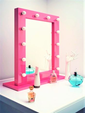 CAPTURE PINK MAKEUP MIRROR Mirror Dimensions– Height 36 inches, Length 24 inches, Width 1.5 inches Frame Finish– Glossy Pink Frame Material– MDF with commercial plywood/ Branded Syska/ Philips LED bulb LED Color: Warm White High quality “Saint Gobain” or Modi Guard Mirror for clear view Style-Classic, Country, Industrial,