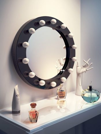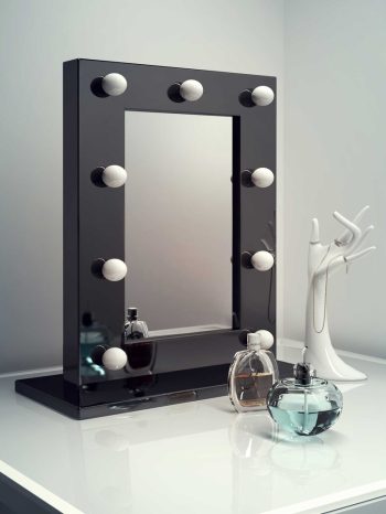 RICH BLACK MAKEUP MIRROR Mirror Dimensions– Height: 30 inches, Length: 24 inches, Width 2 inches Frame Finish– Glossy Black Frame Material- MDF, Duco paint, Mirror with Branded Philips/Syska LED bulb High quality “Saint Gobain” or Modi Guard Mirror for clear view LED Color– Warm White Shape– Rectangle Style-Classic,