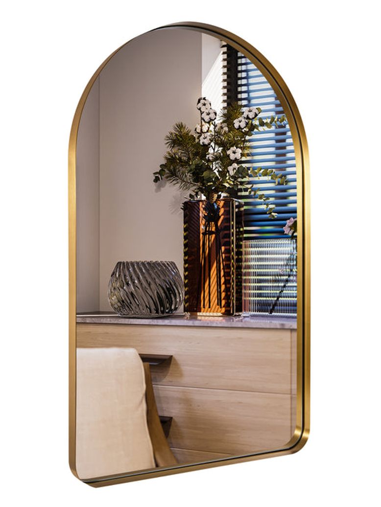 This brass arched decorative mirror crafted by hand with a stainless steel metal frame, our Arched Brass Mirror comes in a range of versatile finishes. With a deep frame design, this modern mirror adds visual interest to any bedroom, bath, or living space. The top arch and rounded corners lend a softness to the design, makes a timeless, high-quality addition above your fireplace, vanity, or in the entryway, bathroom, living room.