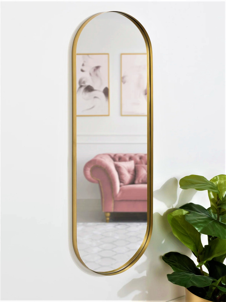 Introduce a touch of timeless elegance and modern flair to your home with the Brass Capsule Long Mirror from Mirror Galaxy. This captivating piece transcends mere functionality, transforming into a statement element that elevates the aesthetic of any room.