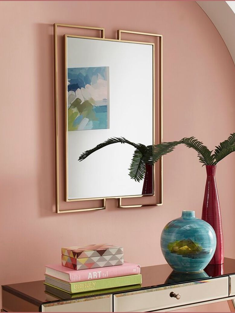 Add a captivating final touch to your entryway or bedroom with this gold-finished craze decorative wall mirror. It features a sleek and shimmery Art Deco-inspired stainless steel frame, so this mirror is sure to bring the right amount of glam to your space. Two open rectangular-patterned borders outline this mirror to allow for a sophisticated edge. With a height of 36″ and width of 24″, we love that you can hang this mirror anywhere you want a standout look in your living room or hallway. It comes with hooks on the back, so you can hang it up when it arrives.