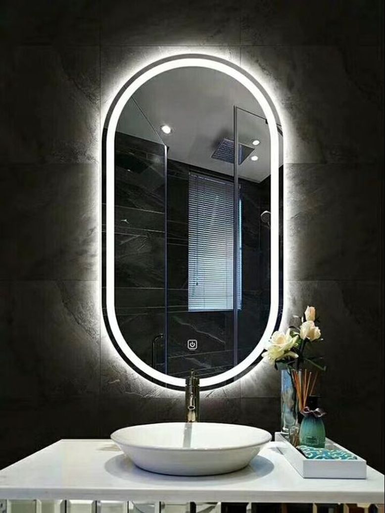 This Dainty led mirror is natural white Led one touch mirror with dimmable, means press for few second on touch button and light will be dimmed. Backside is with WPC/PVC board that is waterproof and termite proof. Touch sensor is off and on operated. Easy to hang and handle.