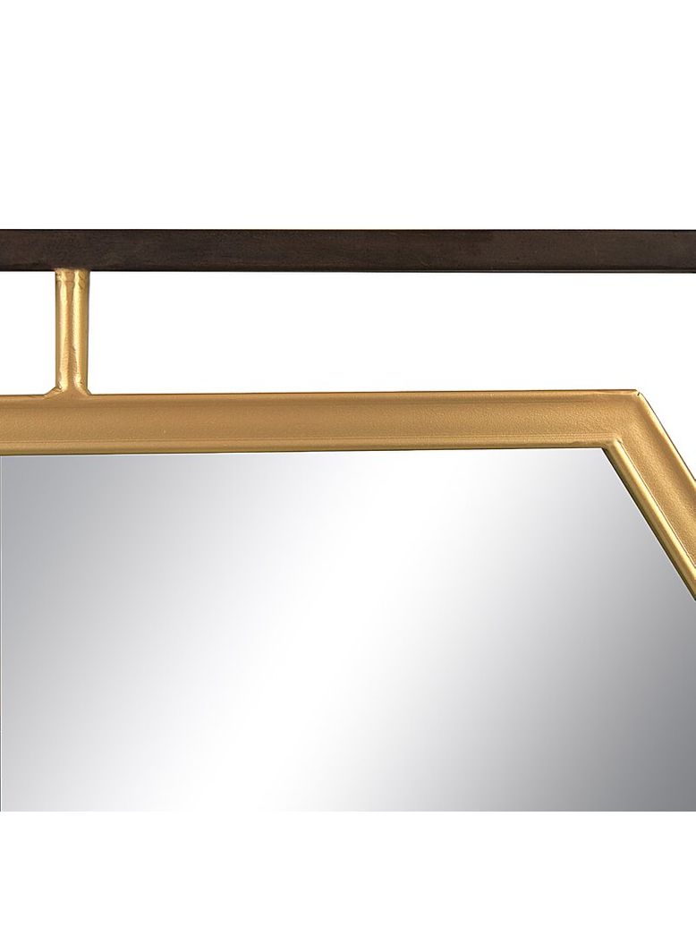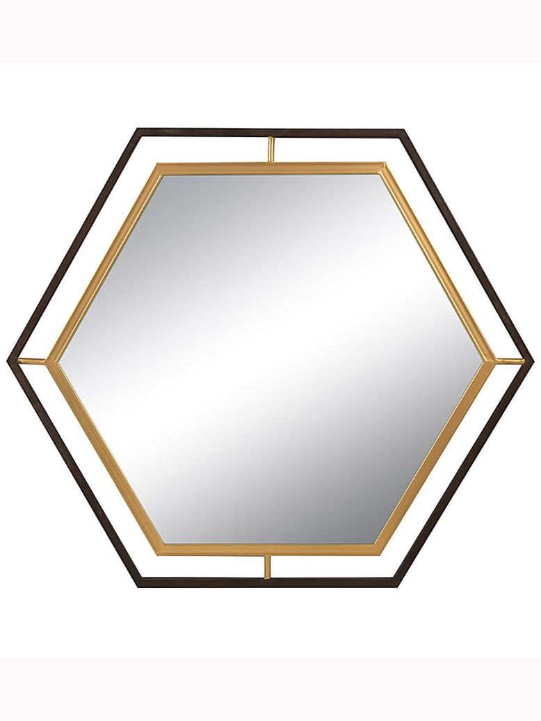 This hexa metal mirror has a geometric silhouette that adds some contemporary glam to your space. It features a reflective glass in the distinctive shape of a hexagon, with angular corners and clean lines. The outer framer has a sleek black outline that hovers above the inner gold finished lines for a dramatic contrast. We love that this mirror has a floating construction that adds to its modern look. It’s perfect for gallery walls, above a sideboard, or as a bedroom accent.